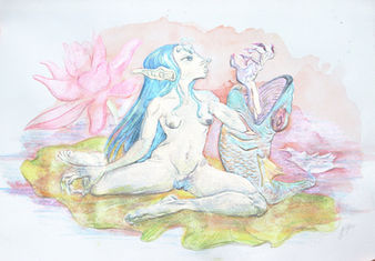 The process begins with a drawing of the fairy, which is transferred onto a block of linoleum and carved out. When sturdy paper is pushed into the carved out linoleum, it conforms to the carving and embosses the character, making a three-dimensional work that imitates the wrinkles and lines of skin stretched or folded over muscle and fat. The final step of the process is painting the embossement with metallic watercolors to brighten the image while highlighting the sculptural aspects of the embossment.